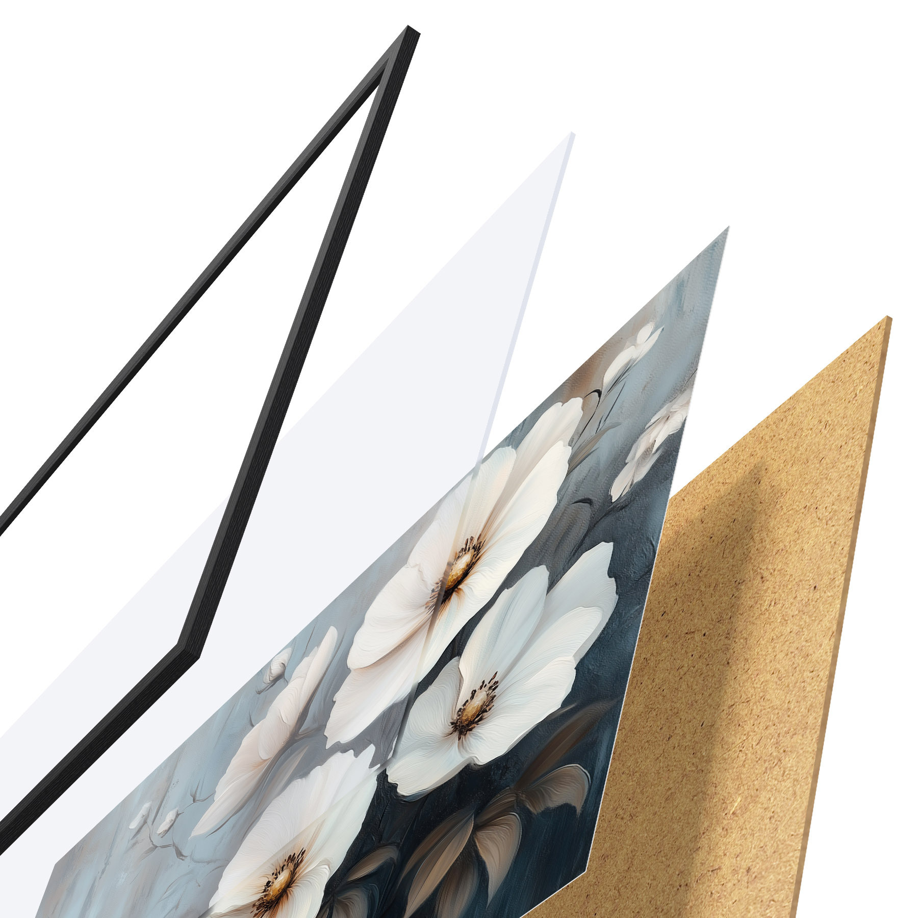 Das Poster besteht aus einem Rahmen, Plexiglas, einem gedruckten Bild und einer Rückwand aus Spanplatten. Dank der Halterungen auf der Rückseite kann das Poster sofort an die Wand gehängt werden.
