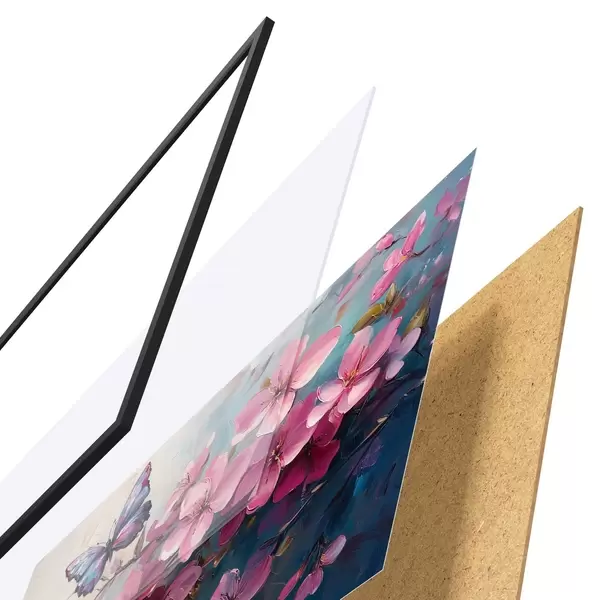 Das Poster besteht aus einem Rahmen, Plexiglas, einem gedruckten Bild und einer Rückwand aus Spanplatten. Dank der Halterungen auf der Rückseite kann das Poster sofort an die Wand gehängt werden.