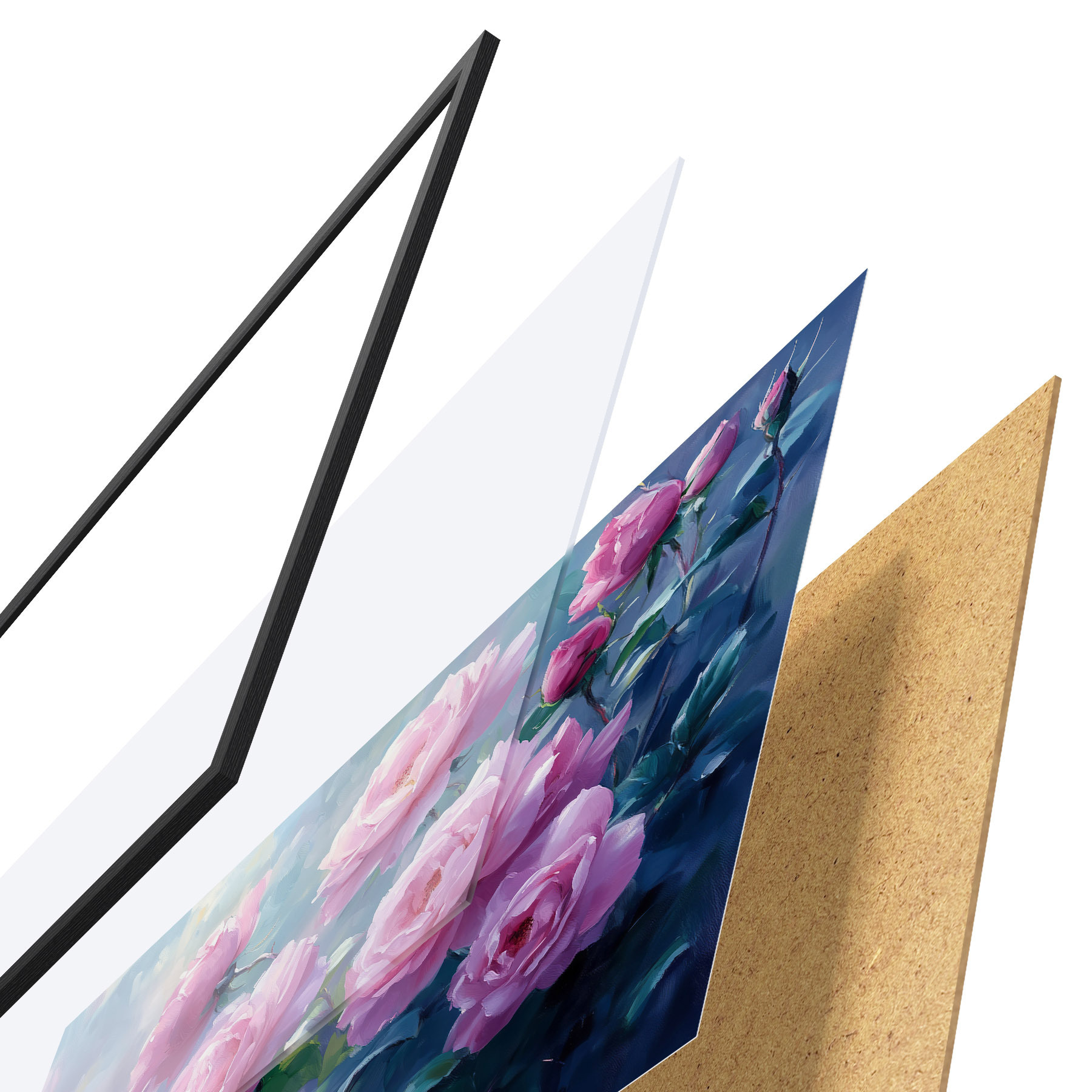 Das Poster besteht aus einem Rahmen, Plexiglas, einem gedruckten Bild und einer Rückwand aus Spanplatten. Dank der Halterungen auf der Rückseite kann das Poster sofort an die Wand gehängt werden.