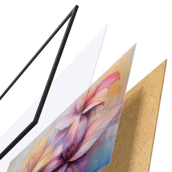 Das Poster besteht aus einem Rahmen, Plexiglas, einem gedruckten Bild und einer Rückwand aus Spanplatten. Dank der Halterungen auf der Rückseite kann das Poster sofort an die Wand gehängt werden.