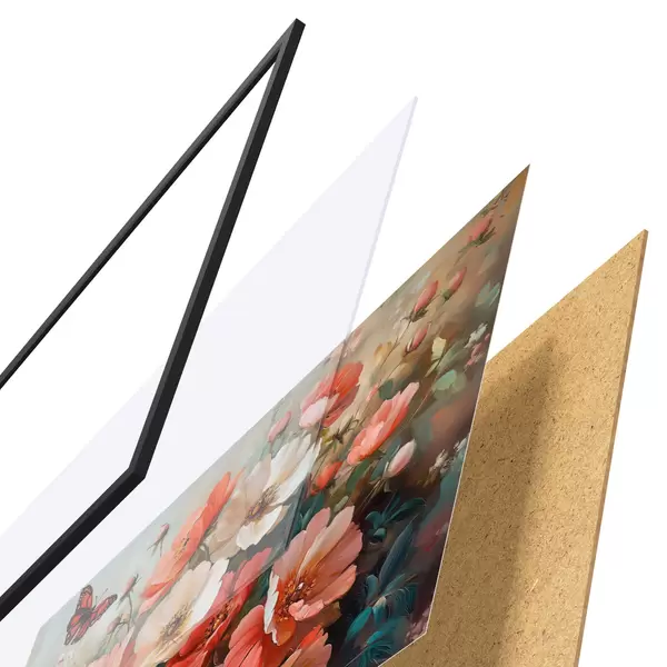 Das Poster besteht aus einem Rahmen, Plexiglas, einem gedruckten Bild und einer Rückwand aus Spanplatten. Dank der Halterungen auf der Rückseite kann das Poster sofort an die Wand gehängt werden.