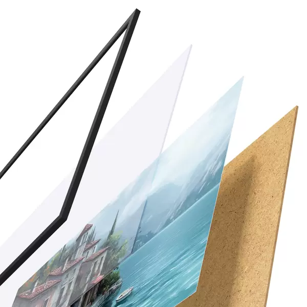Das Poster besteht aus einem Rahmen, Plexiglas, einem gedruckten Bild und einer Rückwand aus Spanplatten. Dank der Halterungen auf der Rückseite kann das Poster sofort an die Wand gehängt werden.