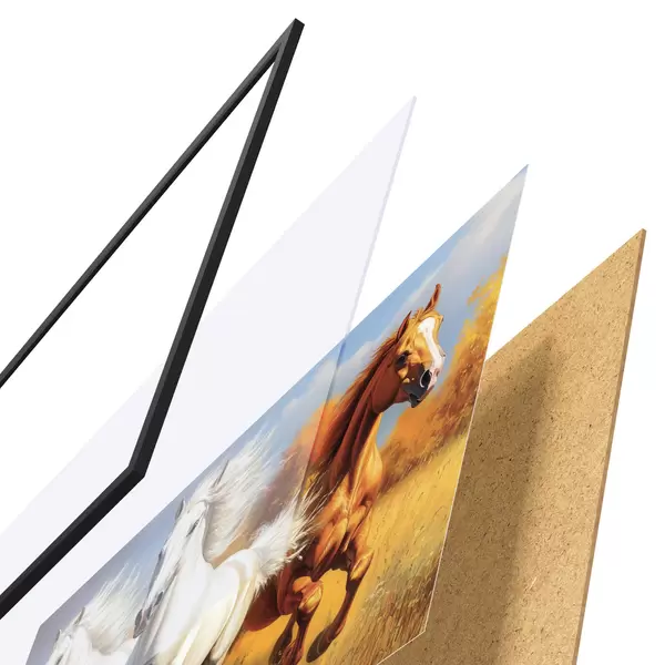Das Poster besteht aus einem Rahmen, Plexiglas, einem gedruckten Bild und einer Rückwand aus Spanplatten. Dank der Halterungen auf der Rückseite kann das Poster sofort an die Wand gehängt werden.