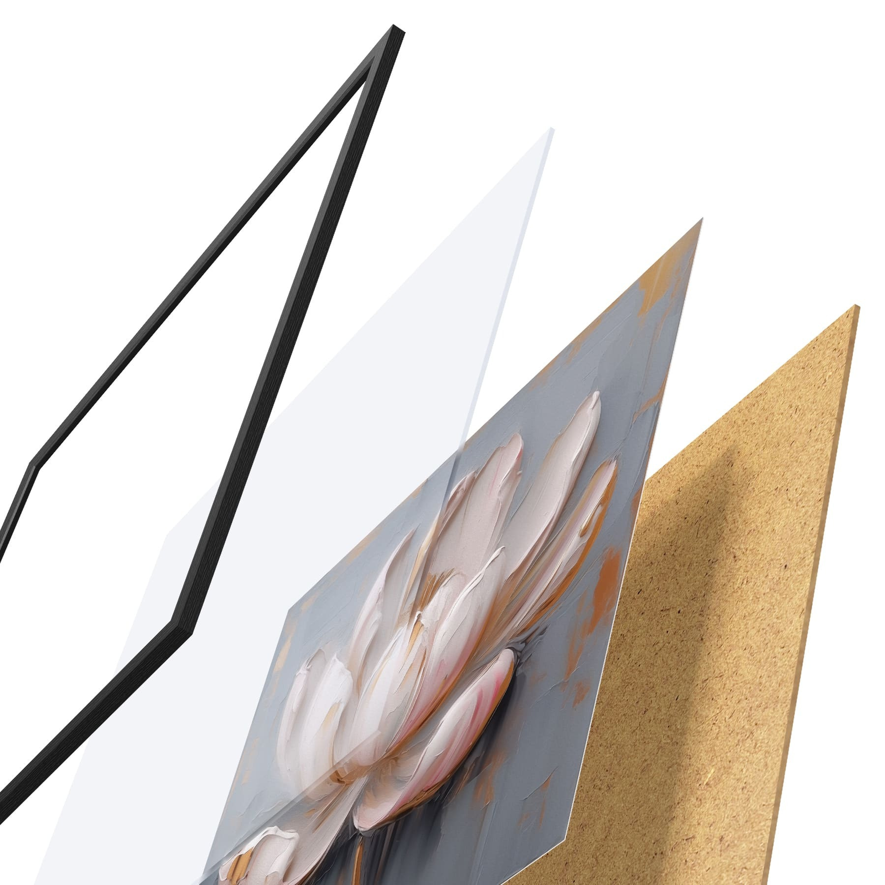 Das Poster besteht aus einem Rahmen, Plexiglas, einem gedruckten Bild und einer Rückwand aus Spanplatten. Dank der Halterungen auf der Rückseite kann das Poster sofort an die Wand gehängt werden.