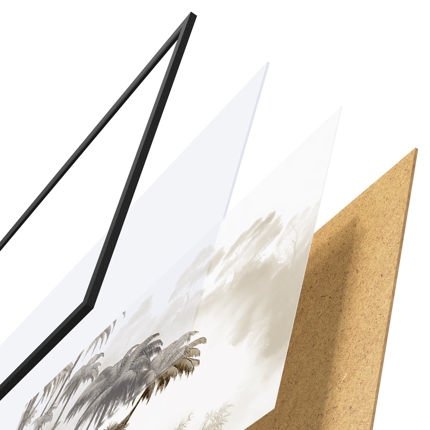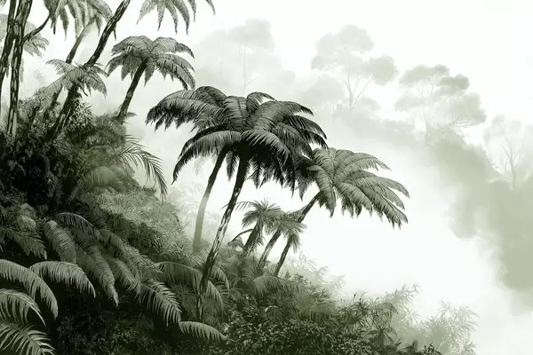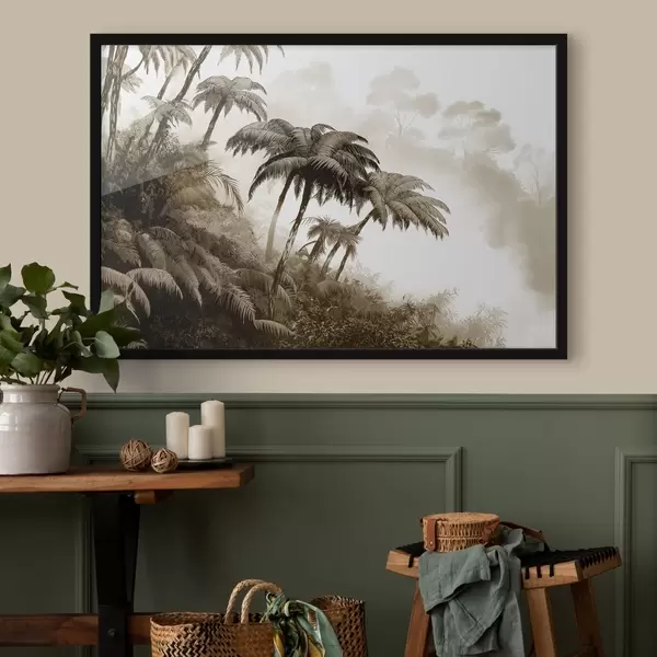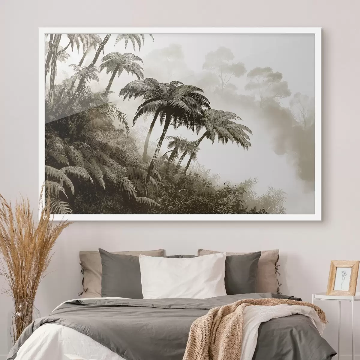Poster Dschungel Wald im Nebel, Palmen, Natur, beige Farben f42372