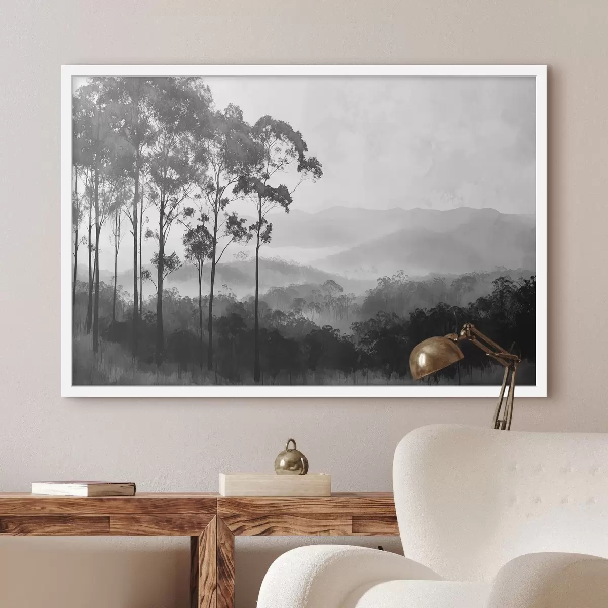 Poster Mystischer Wald in den Grautönen, Naturlandschaft, Bäume f42373
