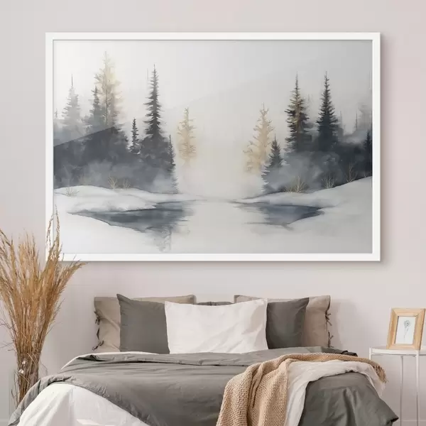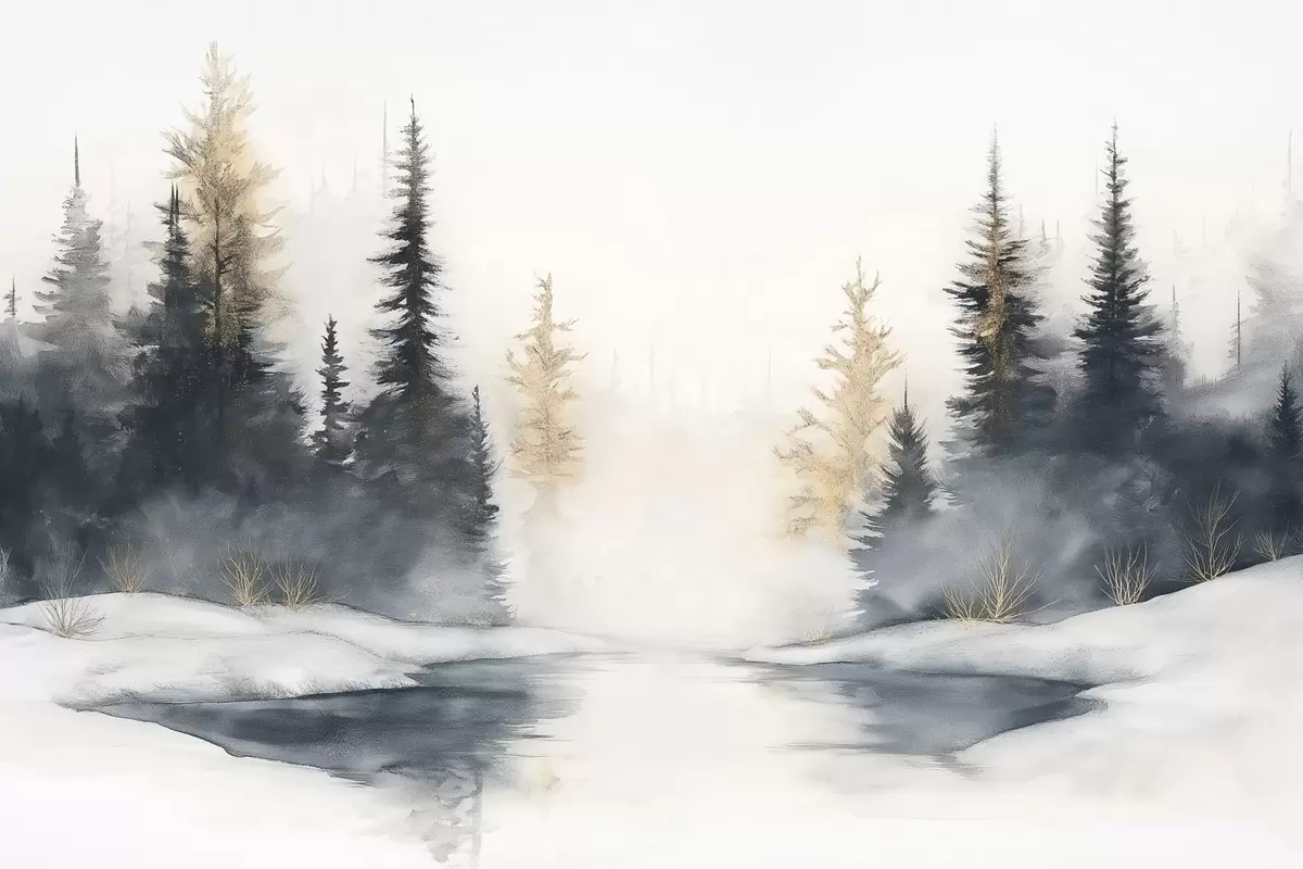 Poster Winterlandschaft mit Fluss und Kiefern, Natur, Wald, Nebel Nr f42374