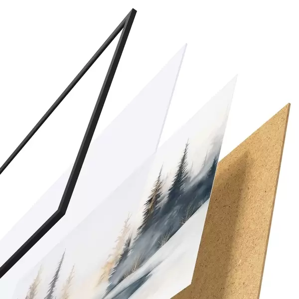 Das Poster besteht aus einem Rahmen, Plexiglas, einem gedruckten Bild und einer Rückwand aus Spanplatten. Dank der Halterungen auf der Rückseite kann das Poster sofort an die Wand gehängt werden.