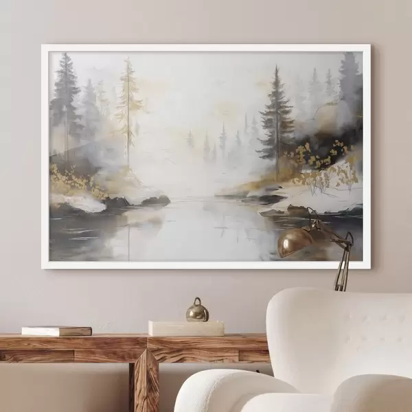 Poster Naturlandschaft mit Fluss, Wald und Kiefern, weiche Pastellfarben Nr f42375