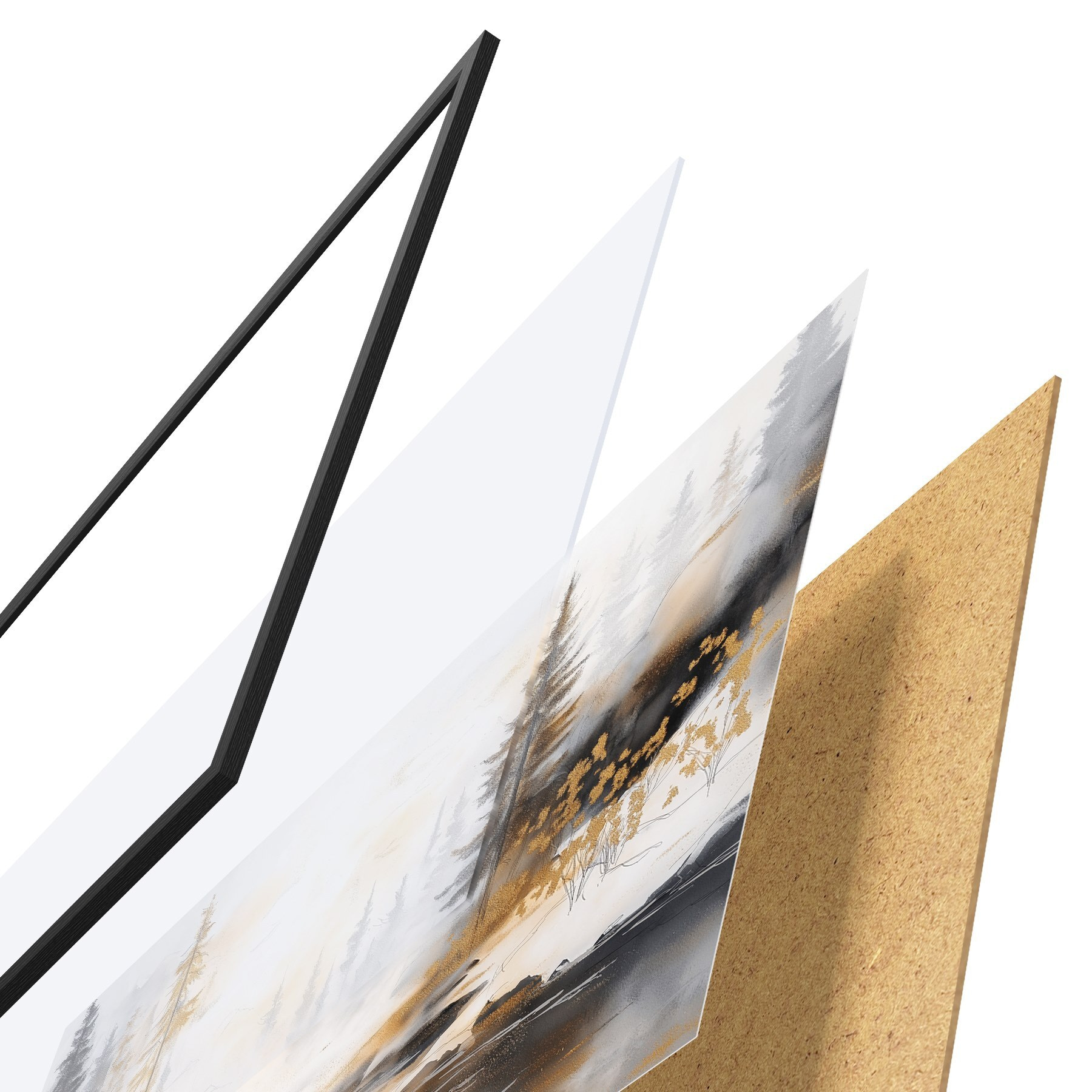 Das Poster besteht aus einem Rahmen, Plexiglas, einem gedruckten Bild und einer Rückwand aus Spanplatten. Dank der Halterungen auf der Rückseite kann das Poster sofort an die Wand gehängt werden.