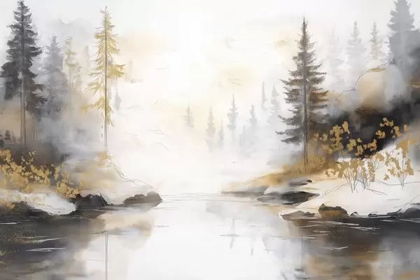 Poster Naturlandschaft mit Fluss, Wald und Kiefern, weiche Pastellfarben Nr f42375