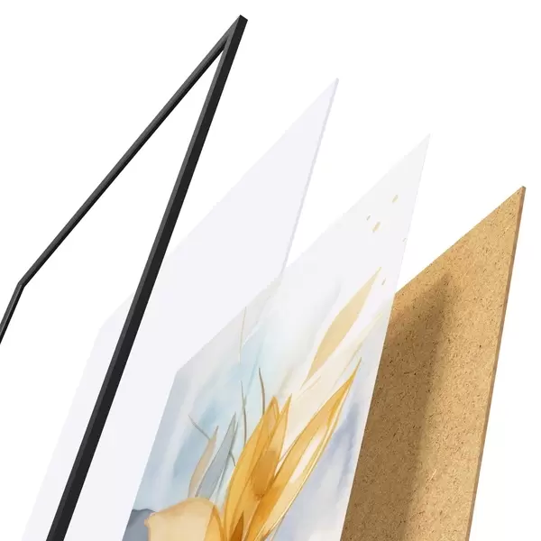 Das Poster besteht aus einem Rahmen, Plexiglas, einem gedruckten Bild und einer Rückwand aus Spanplatten. Dank der Halterungen auf der Rückseite kann das Poster sofort an die Wand gehängt werden.