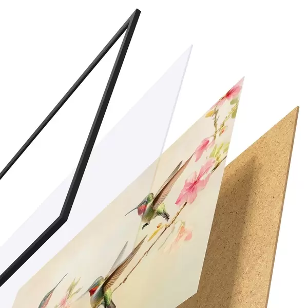 Das Poster besteht aus einem Rahmen, Plexiglas, einem gedruckten Bild und einer Rückwand aus Spanplatten. Dank der Halterungen auf der Rückseite kann das Poster sofort an die Wand gehängt werden.