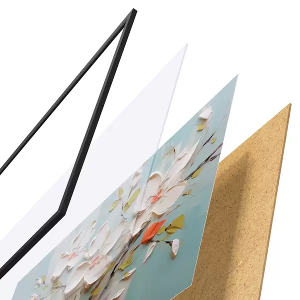 Das Poster besteht aus einem Rahmen, Plexiglas, einem gedruckten Bild und einer Rückwand aus Spanplatten. Dank der Halterungen auf der Rückseite kann das Poster sofort an die Wand gehängt werden.