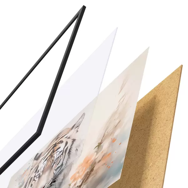 Das Poster besteht aus einem Rahmen, Plexiglas, einem gedruckten Bild und einer Rückwand aus Spanplatten. Dank der Halterungen auf der Rückseite kann das Poster sofort an die Wand gehängt werden.