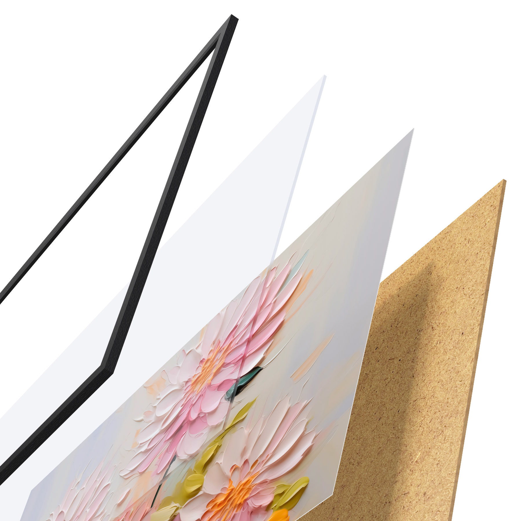 Das Poster besteht aus einem Rahmen, Plexiglas, einem gedruckten Bild und einer Rückwand aus Spanplatten. Dank der Halterungen auf der Rückseite kann das Poster sofort an die Wand gehängt werden.