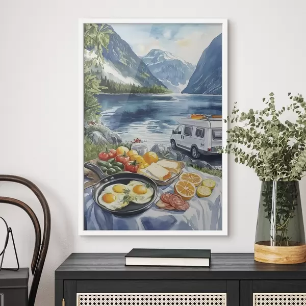Poster Reisen, Leben im Freien, Aquarellstil, Norwegen, Frühstück f42430