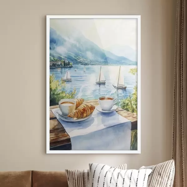 Poster Sommer See mit Segelbooten, Tassen Kaffee, Croissants, Aquarell-Stil Nr f42441