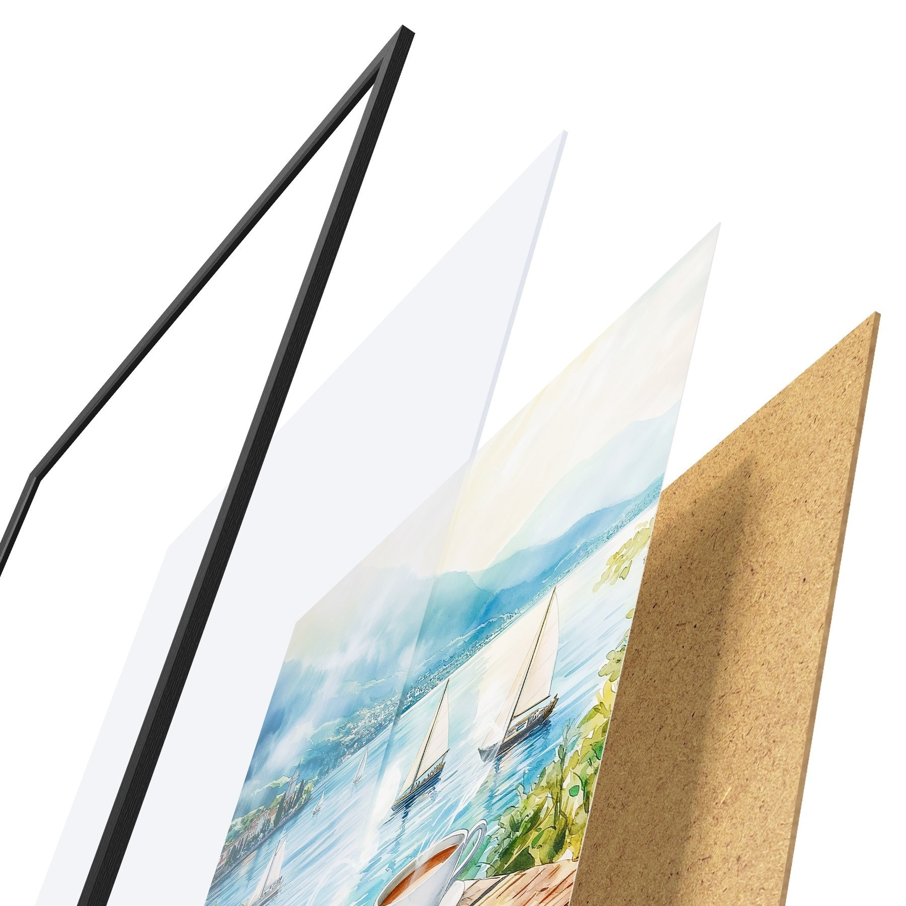 Das Poster besteht aus einem Rahmen, Plexiglas, einem gedruckten Bild und einer Rückwand aus Spanplatten. Dank der Halterungen auf der Rückseite kann das Poster sofort an die Wand gehängt werden.