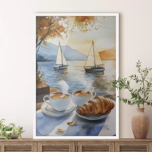 Poster Sonnenuntergang auf dem See, Segelboote, Tassen Kaffee, Aquarell-Stil f42442