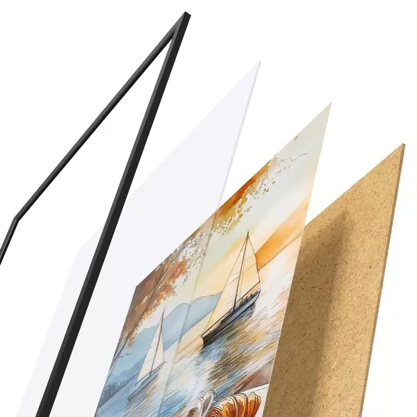 Das Poster besteht aus einem Rahmen, Plexiglas, einem gedruckten Bild und einer Rückwand aus Spanplatten. Dank der Halterungen auf der Rückseite kann das Poster sofort an die Wand gehängt werden.