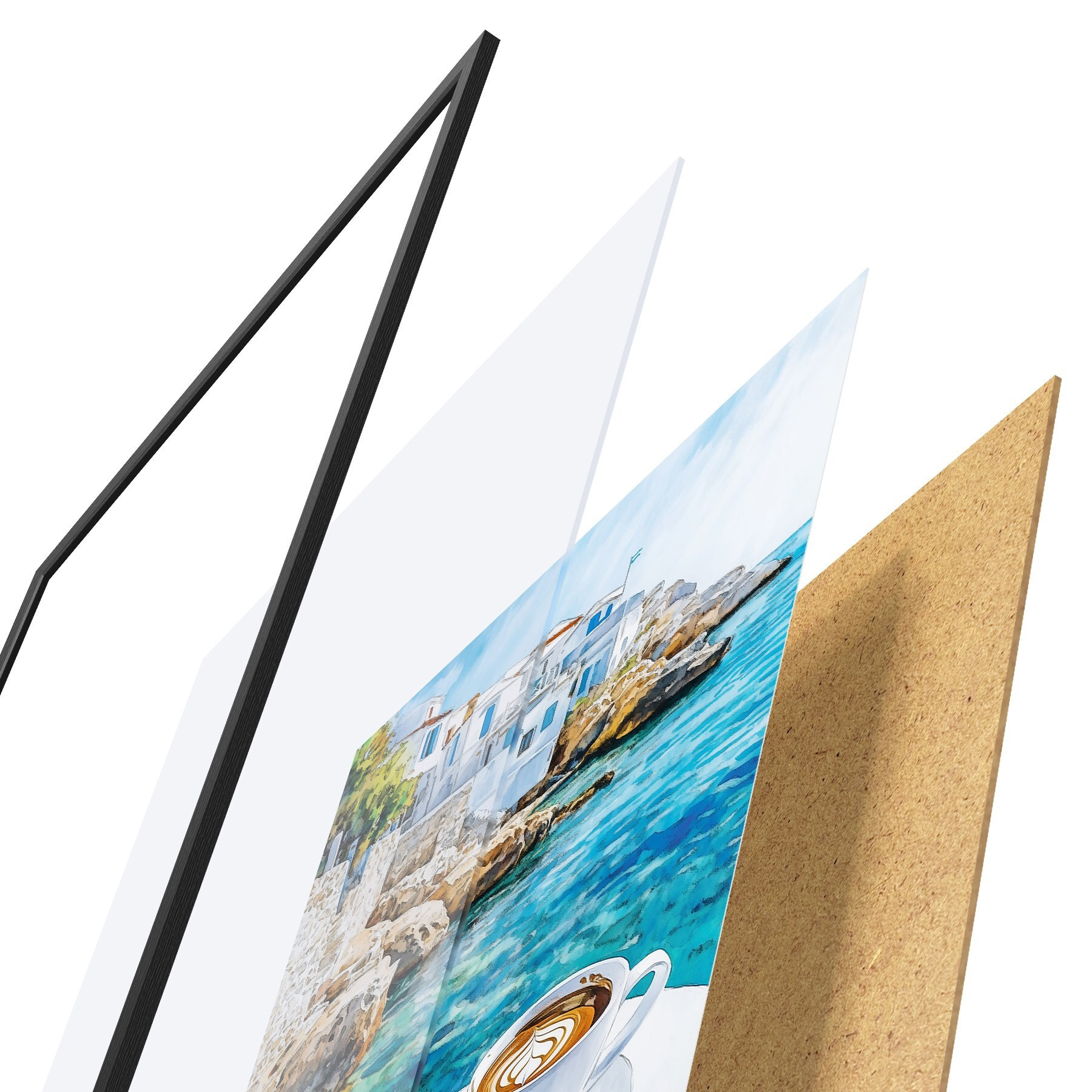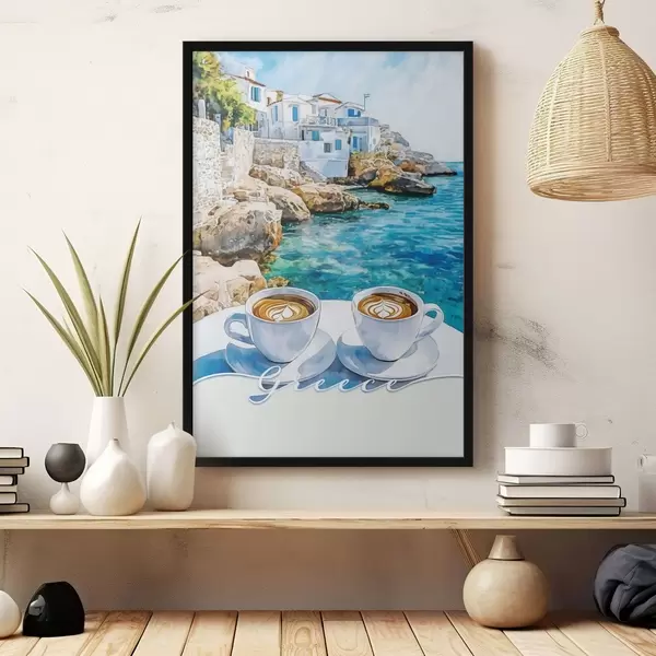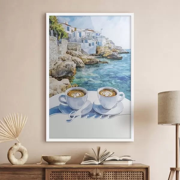 Poster Griechenland Ästhetik, Tassen Kaffee, blaues Meer, alte Stadt, Reisen f42447
