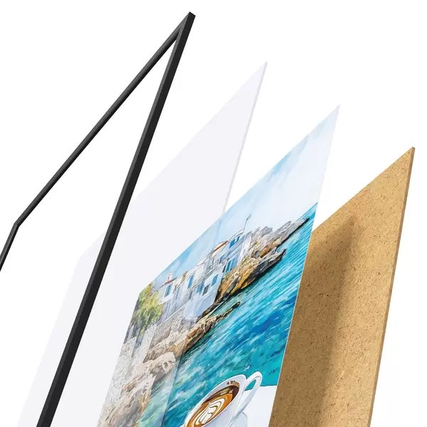 Das Poster besteht aus einem Rahmen, Plexiglas, einem gedruckten Bild und einer Rückwand aus Spanplatten. Dank der Halterungen auf der Rückseite kann das Poster sofort an die Wand gehängt werden.