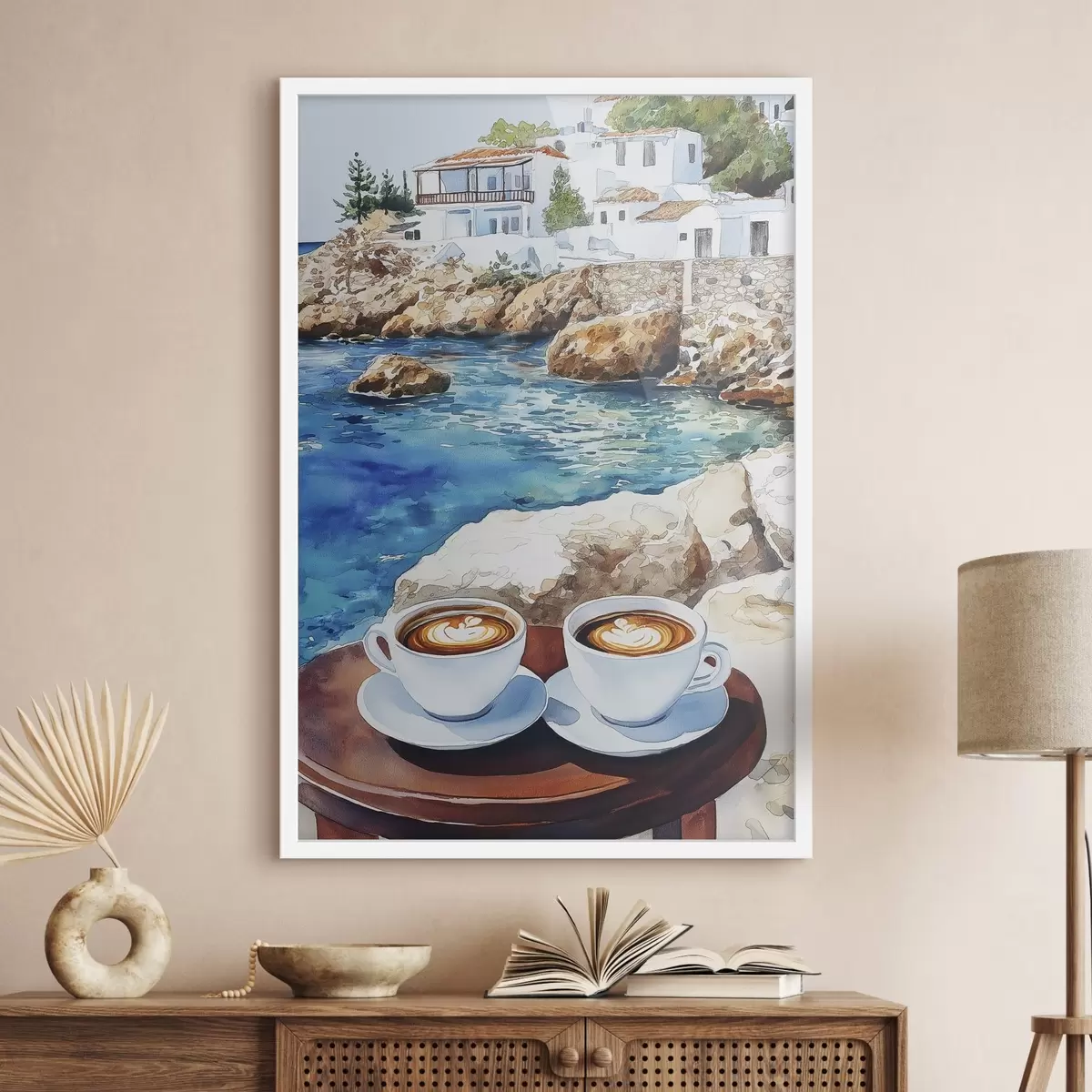 Poster Aquarell Seeseite mit Tassen Kaffee, Sommer Nr f42449