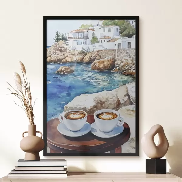Poster Aquarell Seeseite mit Tassen Kaffee, Sommer f42449