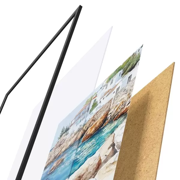 Das Poster besteht aus einem Rahmen, Plexiglas, einem gedruckten Bild und einer Rückwand aus Spanplatten. Dank der Halterungen auf der Rückseite kann das Poster sofort an die Wand gehängt werden.