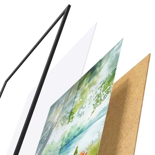 Das Poster besteht aus einem Rahmen, Plexiglas, einem gedruckten Bild und einer Rückwand aus Spanplatten. Dank der Halterungen auf der Rückseite kann das Poster sofort an die Wand gehängt werden.