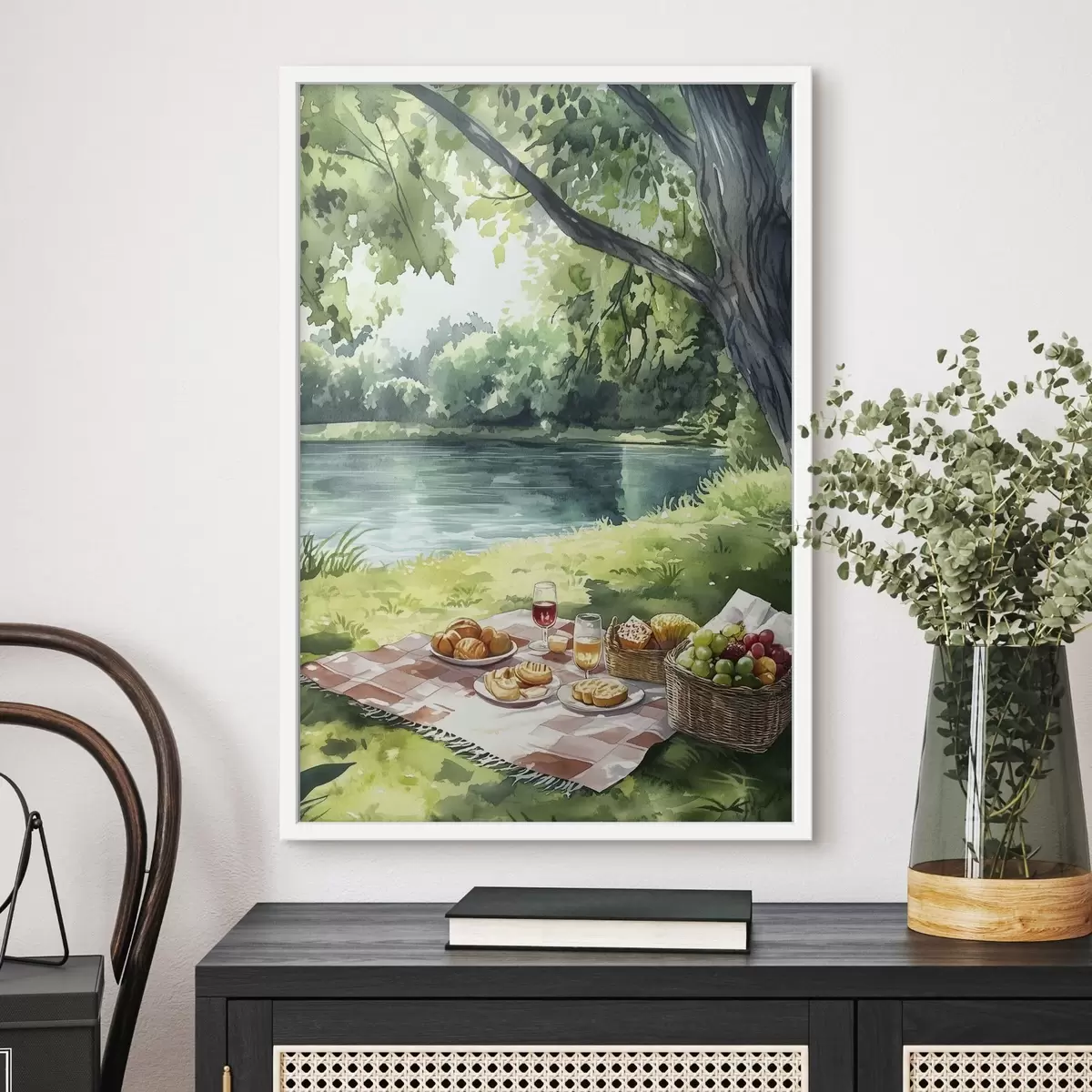 Poster Wunderschönes romantisches Picknick am sommerlichen See, Früchte, Grünzeug f42451