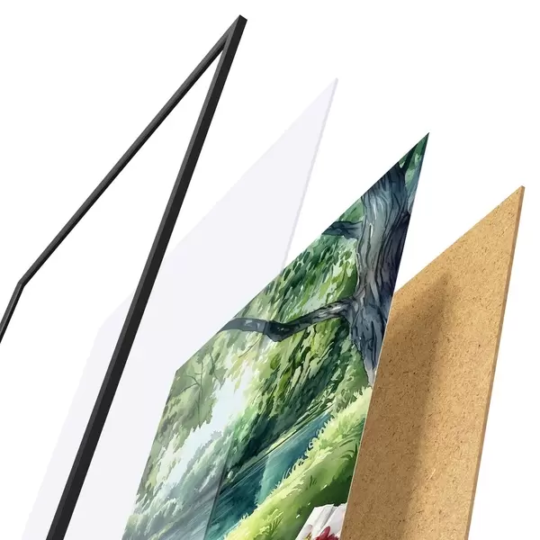 Das Poster besteht aus einem Rahmen, Plexiglas, einem gedruckten Bild und einer Rückwand aus Spanplatten. Dank der Halterungen auf der Rückseite kann das Poster sofort an die Wand gehängt werden.