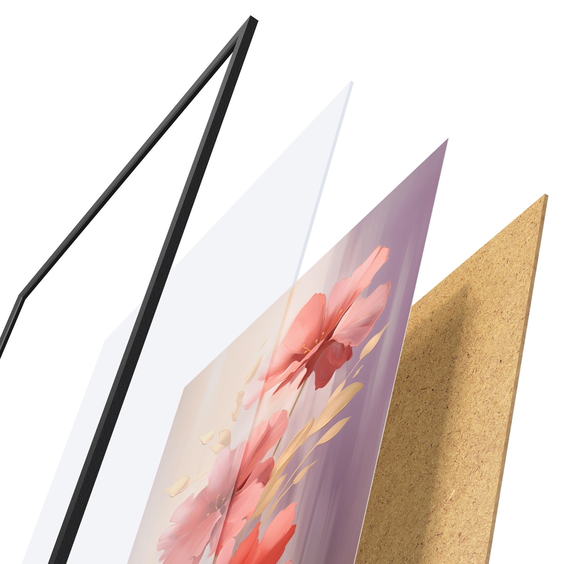 Das Poster besteht aus einem Rahmen, Plexiglas, einem gedruckten Bild und einer Rückwand aus Spanplatten. Dank der Halterungen auf der Rückseite kann das Poster sofort an die Wand gehängt werden.