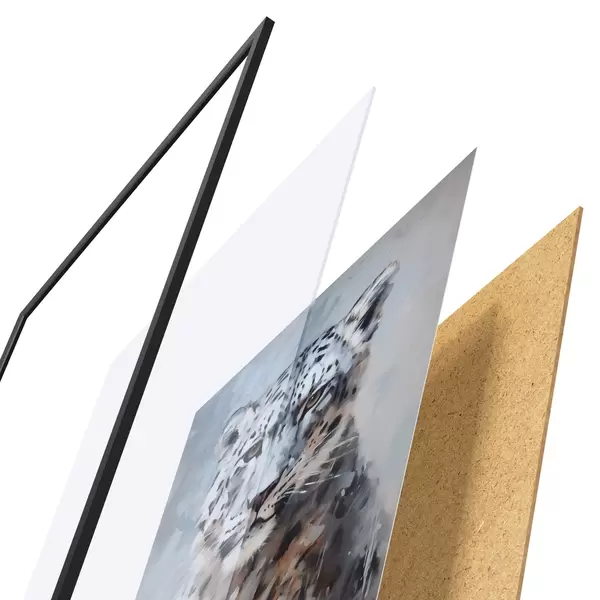Das Poster besteht aus einem Rahmen, Plexiglas, einem gedruckten Bild und einer Rückwand aus Spanplatten. Dank der Halterungen auf der Rückseite kann das Poster sofort an die Wand gehängt werden.