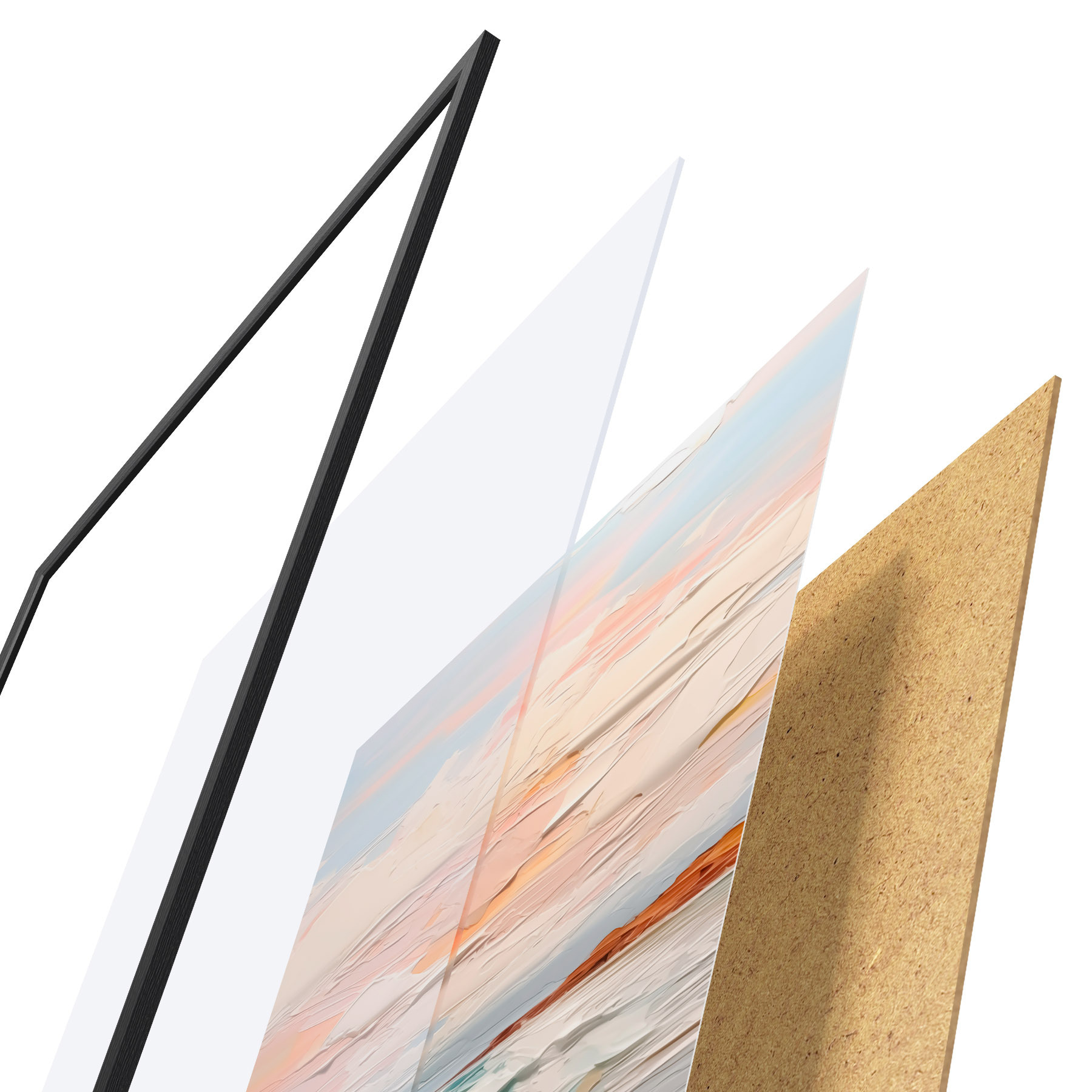 Das Poster besteht aus einem Rahmen, Plexiglas, einem gedruckten Bild und einer Rückwand aus Spanplatten. Dank der Halterungen auf der Rückseite kann das Poster sofort an die Wand gehängt werden.