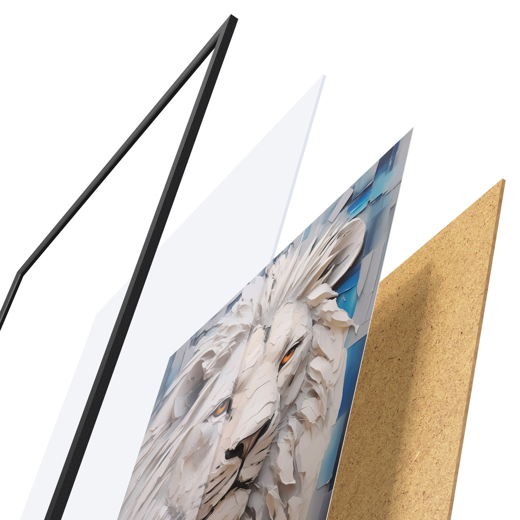 Das Poster besteht aus einem Rahmen, Plexiglas, einem gedruckten Bild und einer Rückwand aus Spanplatten. Dank der Halterungen auf der Rückseite kann das Poster sofort an die Wand gehängt werden.