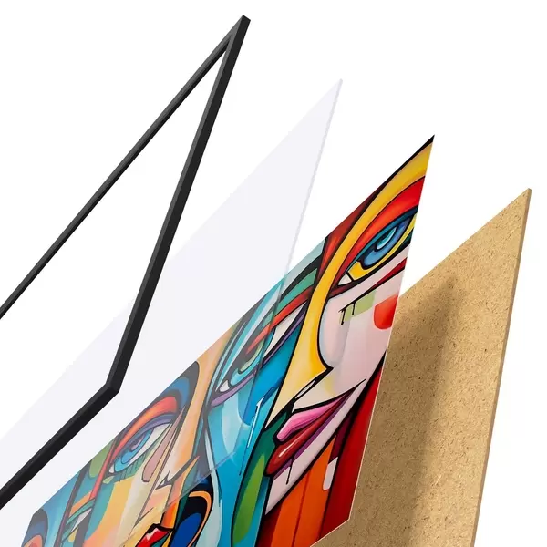 Das Poster besteht aus einem Rahmen, Plexiglas, einem gedruckten Bild und einer Rückwand aus Spanplatten. Dank der Halterungen auf der Rückseite kann das Poster sofort an die Wand gehängt werden.