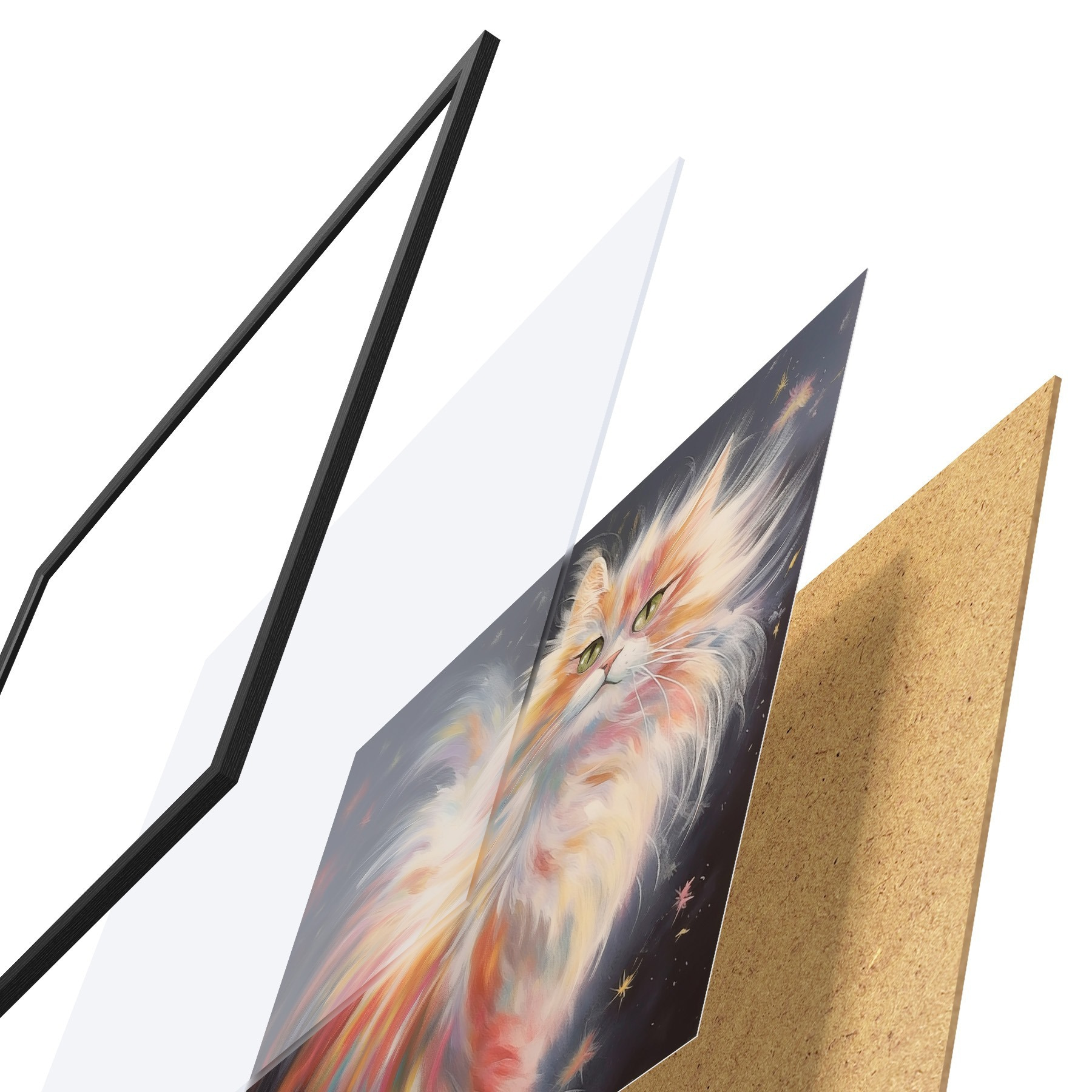 Das Poster besteht aus einem Rahmen, Plexiglas, einem gedruckten Bild und einer Rückwand aus Spanplatten. Dank der Halterungen auf der Rückseite kann das Poster sofort an die Wand gehängt werden.