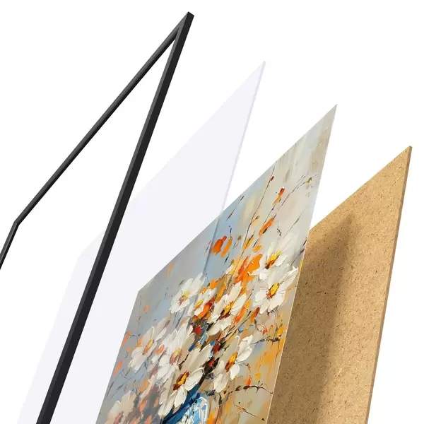 Das Poster besteht aus einem Rahmen, Plexiglas, einem gedruckten Bild und einer Rückwand aus Spanplatten. Dank der Halterungen auf der Rückseite kann das Poster sofort an die Wand gehängt werden.