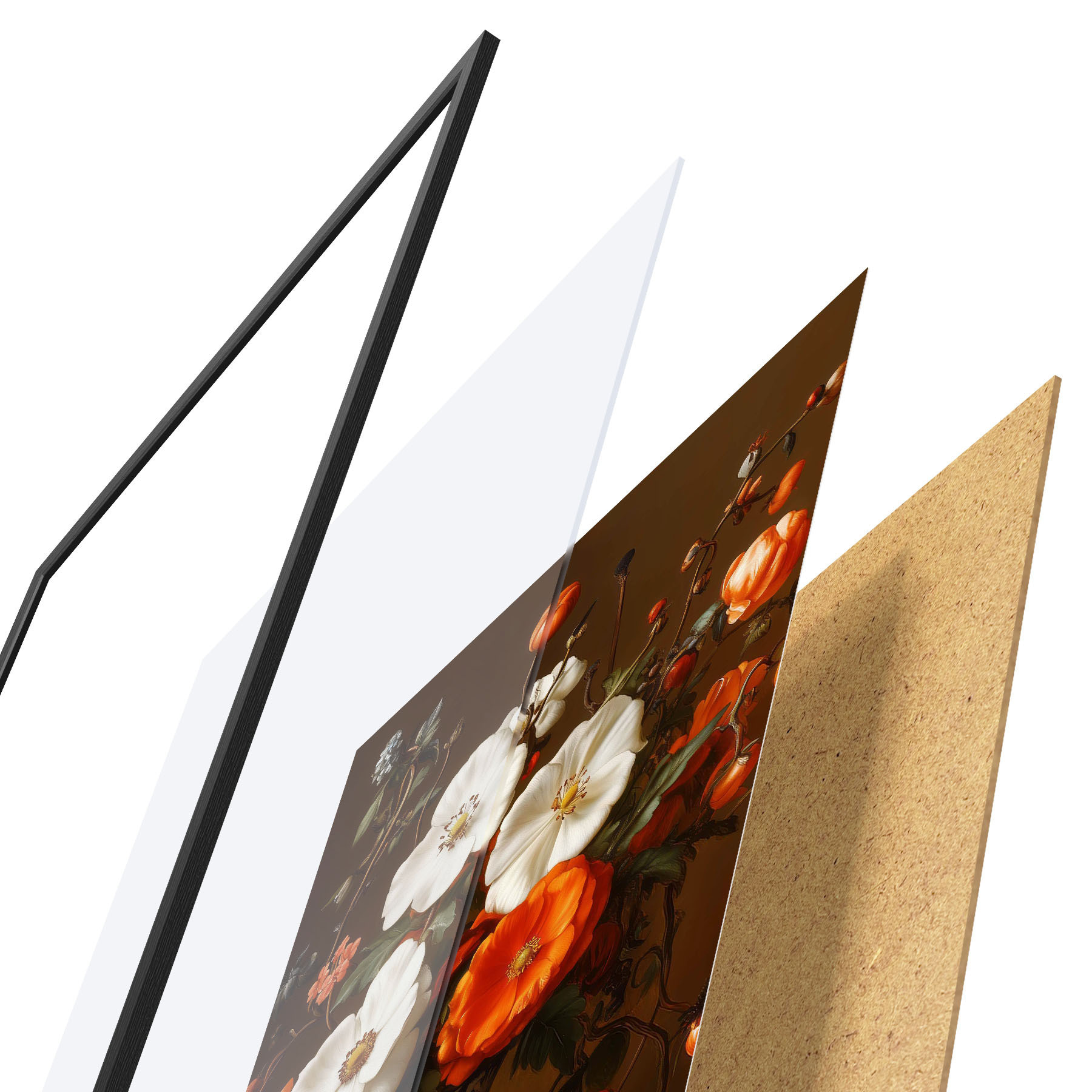 Das Poster besteht aus einem Rahmen, Plexiglas, einem gedruckten Bild und einer Rückwand aus Spanplatten. Dank der Halterungen auf der Rückseite kann das Poster sofort an die Wand gehängt werden.