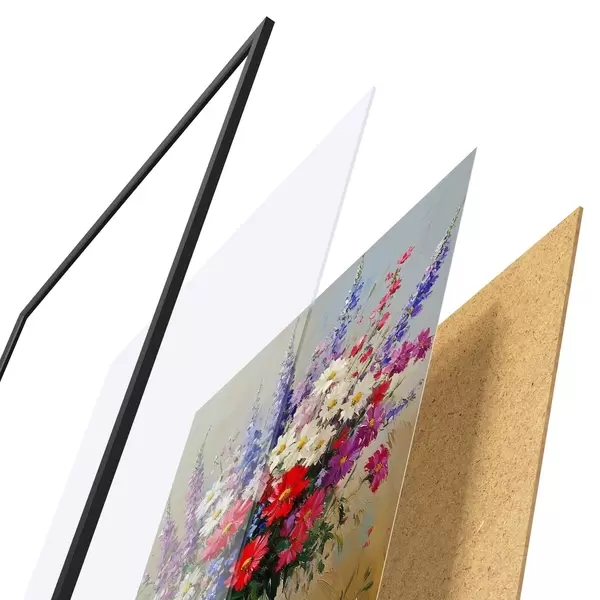 Das Poster besteht aus einem Rahmen, Plexiglas, einem gedruckten Bild und einer Rückwand aus Spanplatten. Dank der Halterungen auf der Rückseite kann das Poster sofort an die Wand gehängt werden.
