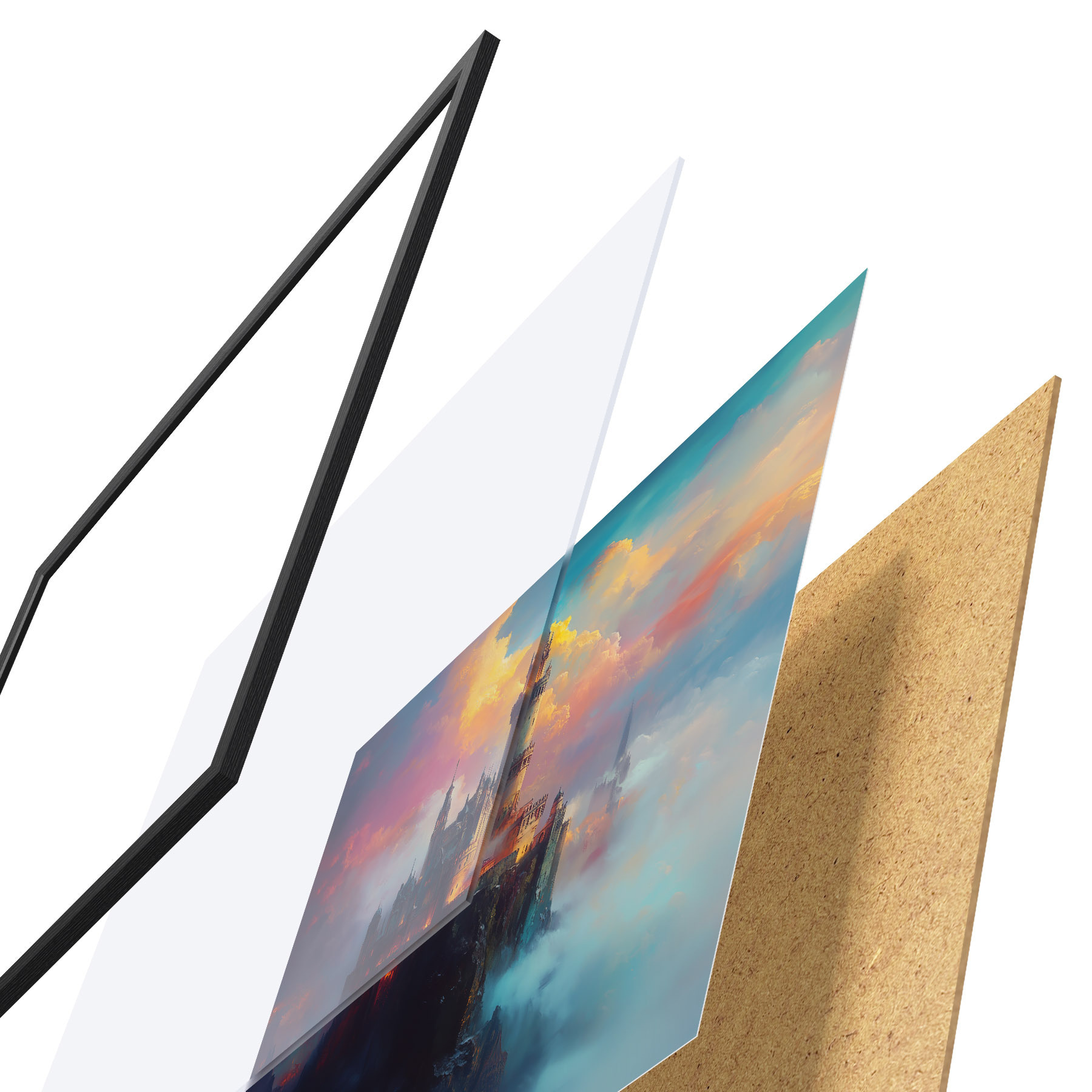 Das Poster besteht aus einem Rahmen, Plexiglas, einem gedruckten Bild und einer Rückwand aus Spanplatten. Dank der Halterungen auf der Rückseite kann das Poster sofort an die Wand gehängt werden.
