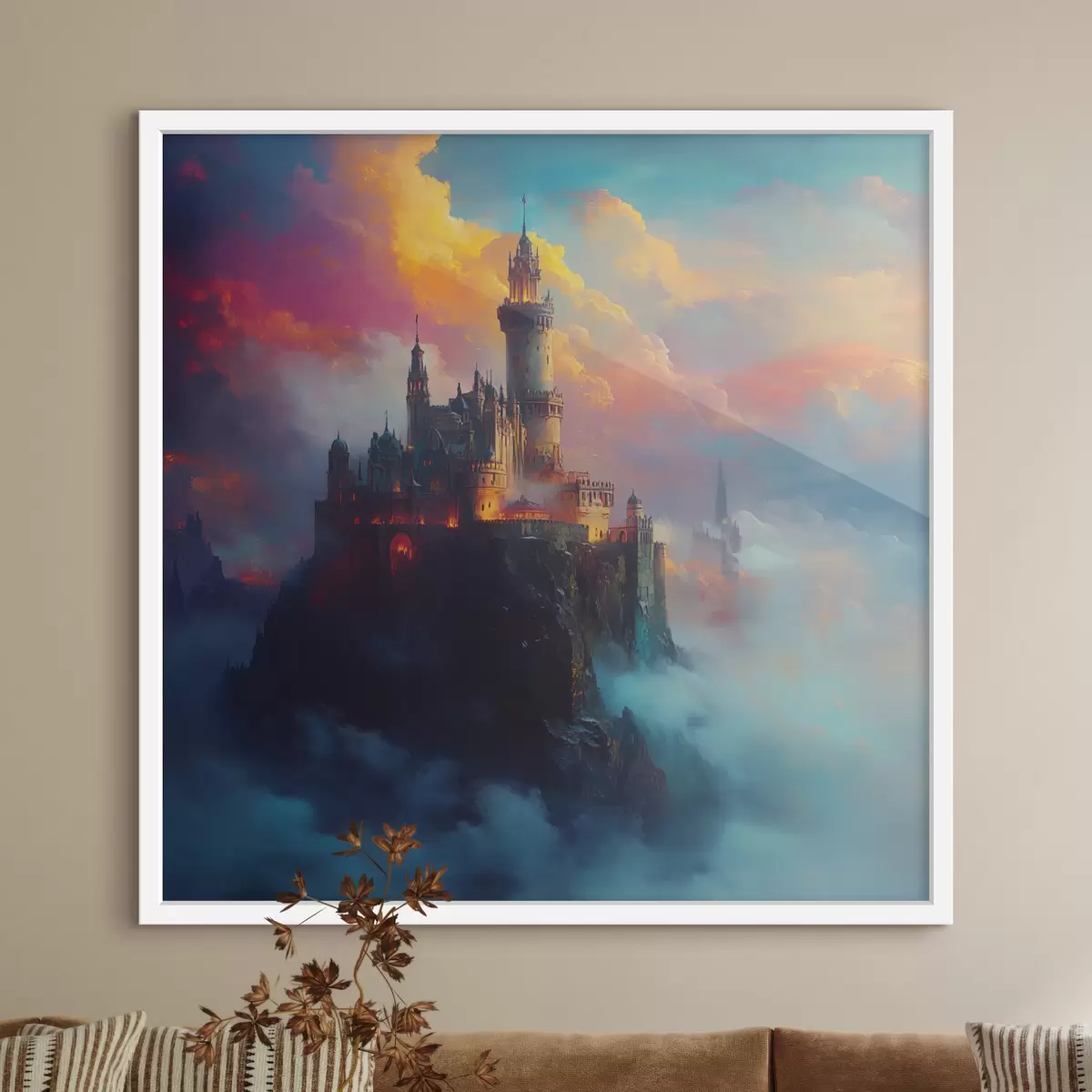 Poster Burg auf einem Felsen in den Wolken f42501