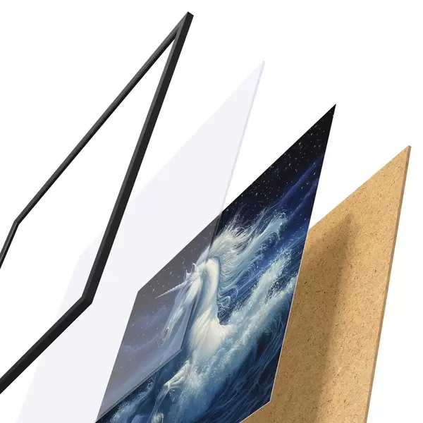 Das Poster besteht aus einem Rahmen, Plexiglas, einem gedruckten Bild und einer Rückwand aus Spanplatten. Dank der Halterungen auf der Rückseite kann das Poster sofort an die Wand gehängt werden.