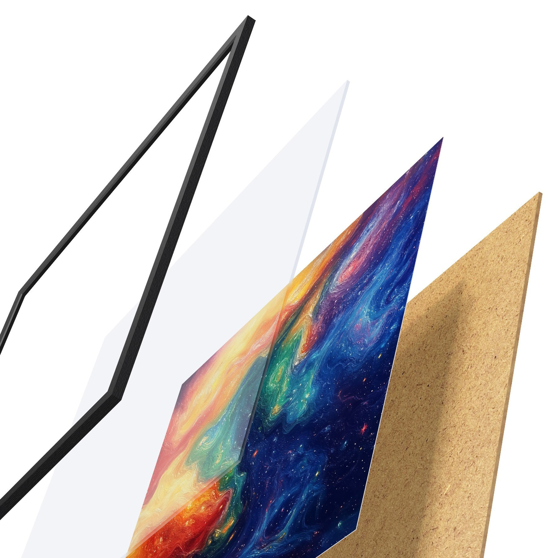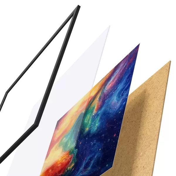 Das Poster besteht aus einem Rahmen, Plexiglas, einem gedruckten Bild und einer Rückwand aus Spanplatten. Dank der Halterungen auf der Rückseite kann das Poster sofort an die Wand gehängt werden.