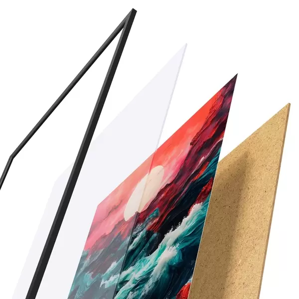 Das Poster besteht aus einem Rahmen, Plexiglas, einem gedruckten Bild und einer Rückwand aus Spanplatten. Dank der Halterungen auf der Rückseite kann das Poster sofort an die Wand gehängt werden.