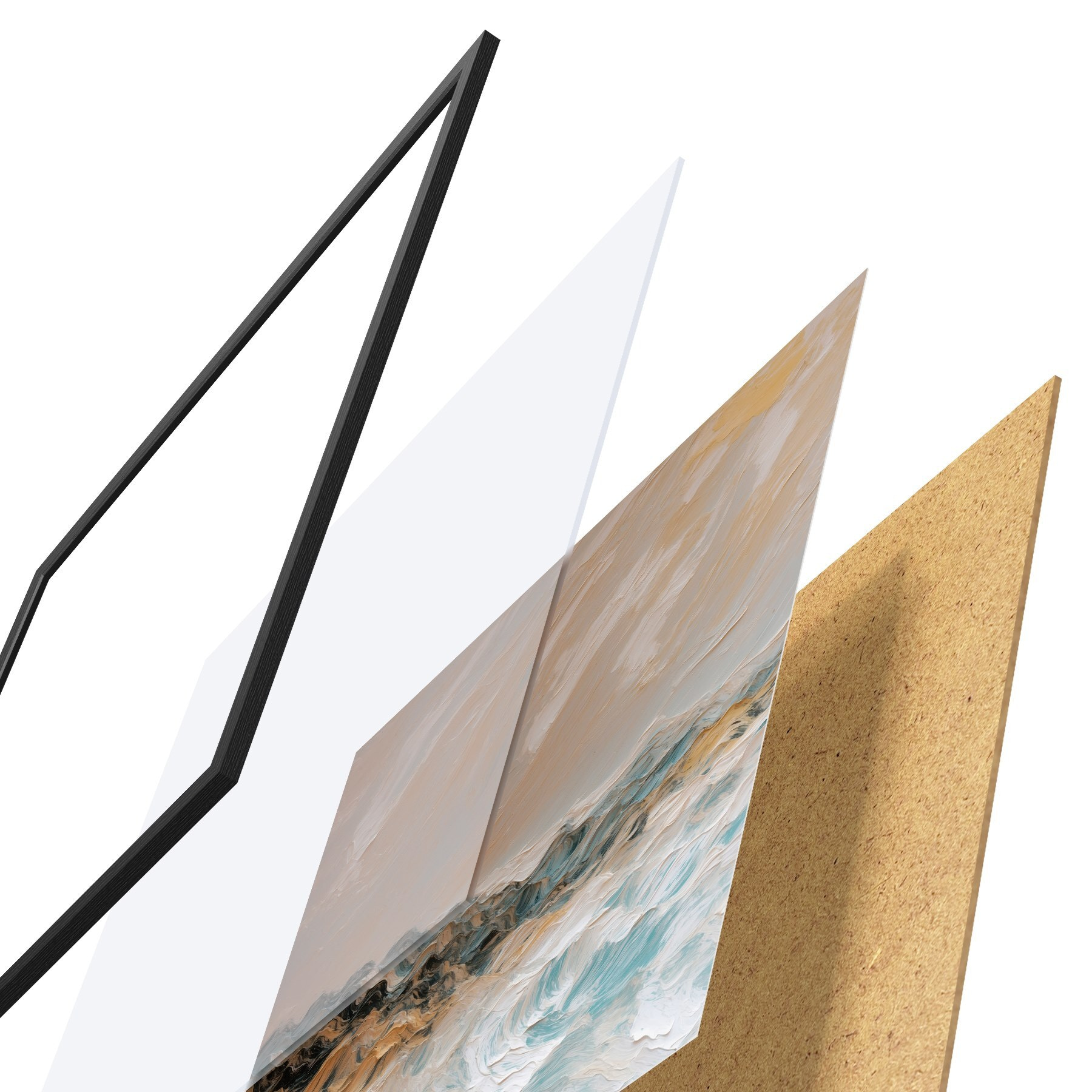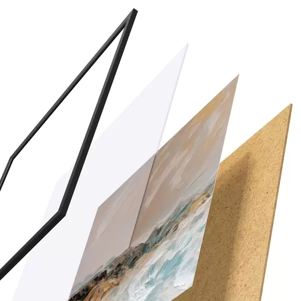 Das Poster besteht aus einem Rahmen, Plexiglas, einem gedruckten Bild und einer Rückwand aus Spanplatten. Dank der Halterungen auf der Rückseite kann das Poster sofort an die Wand gehängt werden.
