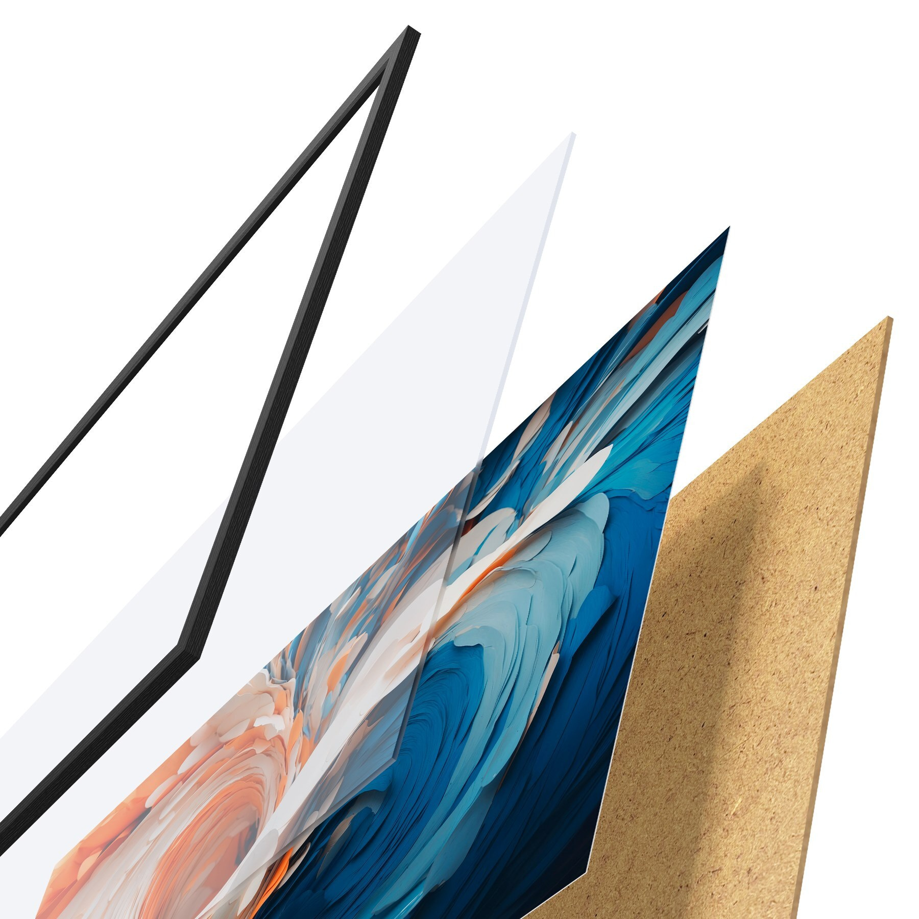 Das Poster besteht aus einem Rahmen, Plexiglas, einem gedruckten Bild und einer Rückwand aus Spanplatten. Dank der Halterungen auf der Rückseite kann das Poster sofort an die Wand gehängt werden.