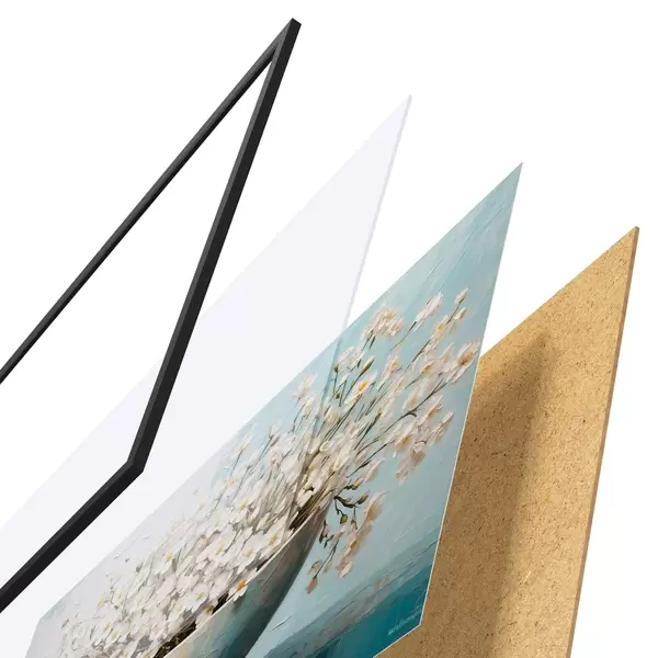 Das Poster besteht aus einem Rahmen, Plexiglas, einem gedruckten Bild und einer Rückwand aus Spanplatten. Dank der Halterungen auf der Rückseite kann das Poster sofort an die Wand gehängt werden.